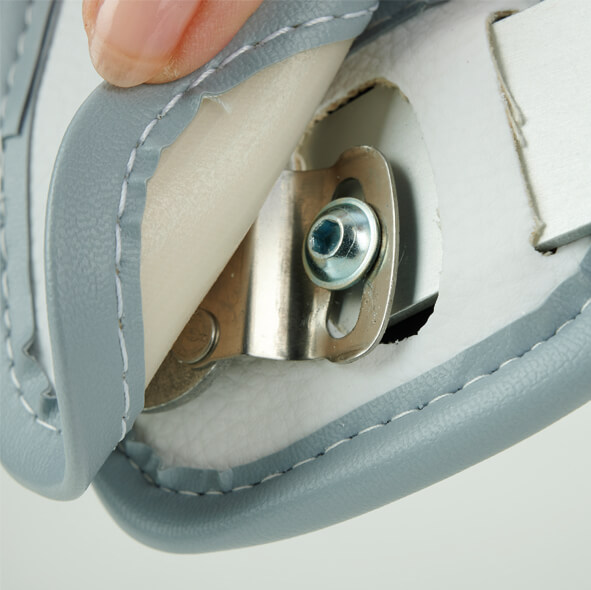 Adjustable three-point corset made of aluminium and synthetic leather for postoperative treatment, designed to limit spinal flexion and lateral movement. The corset is adjustable in height and chest circumference, and features a rotatable chest plate with graduated markings for easy angle adjustment. The lower bar can be set in either a mobile or fixed position. Adjustable back plate.